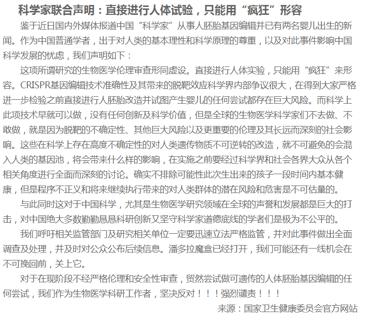 據(jù)了解,事情的起因是賀建奎在第二屆國際人類基因組編輯峰會召開前一天宣布,一對名為露露和娜娜的基因編輯嬰兒于11月在中國誕生。