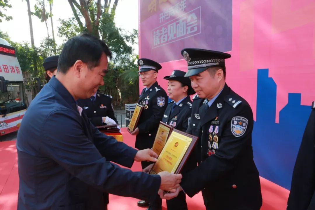 深圳市公安局與深圳特區(qū)報合辦的“每日警星”專欄讀者粉絲見面會在福田分局開放點火熱開展,來自深圳警隊刑偵、掃黑攻堅、治安、社區(qū)、特警、交警、預審等各個崗位的14名“每日警星”代表現場激情合唱中國人民警察警歌;徐文海與深圳報業(yè)集團黨組副書記、副社長、總編輯周斌共同為“每日警星”代表頒發(fā)紀念牌。