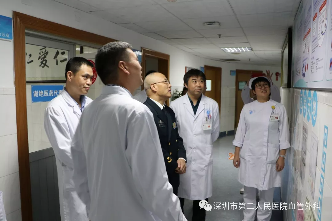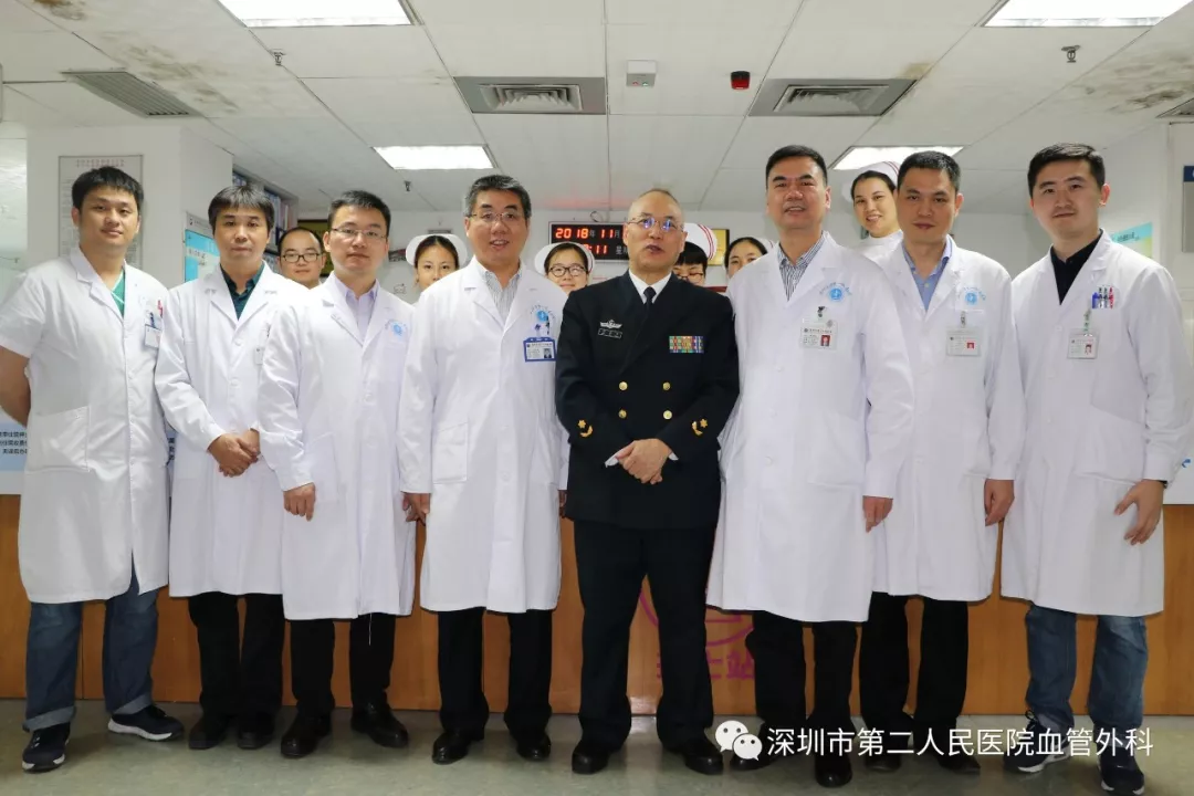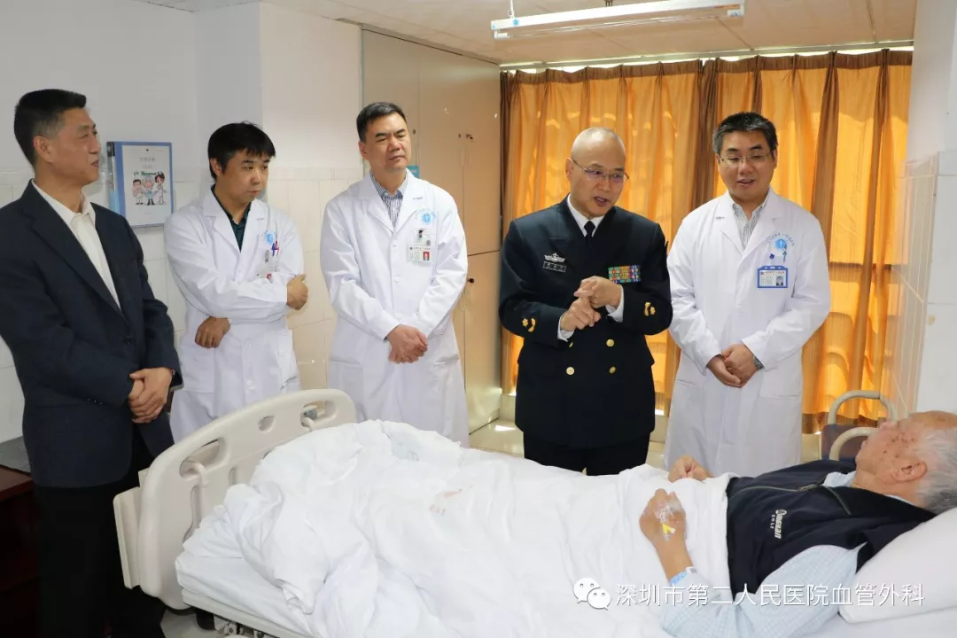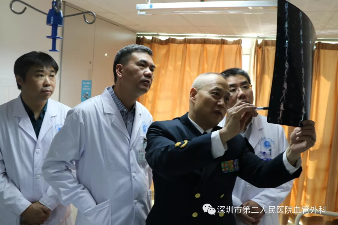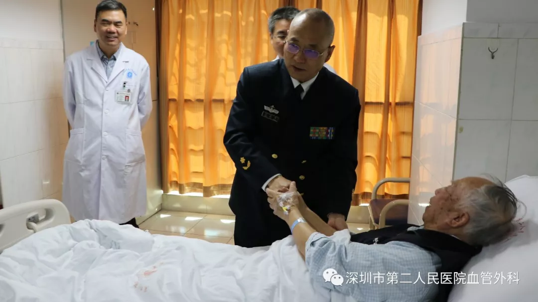 座談會結束后,景在平教授、趙永勝副院長與科室醫(yī)護人員一起,進行了床邊臨床教學查房,同時為一位腹主動脈瘤疾病患者會診。患者是抗美援朝老英雄(享受軍級待遇),因發(fā)現(xiàn)腹主動脈瘤(俗稱“不定時炸彈”)后,一直深受該疾病困擾,一度不愿意接受治療。經(jīng)過景在平教授詳細講解后豁然開朗,同意接受治療,并要求在景在平教授團隊及朱國獻主任團隊下進行手術治療。會診結束時,老先生緊緊握住景在平教授的手,萬分感激。