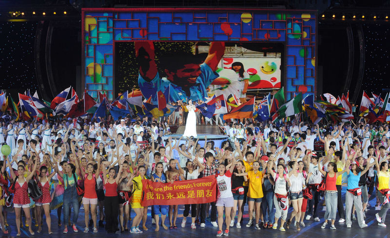 2011年8月23日,第26屆世界大學生夏季運動會閉幕式在深圳舉行。這是閉幕式上打出的“我們永遠是朋友”的橫幅。