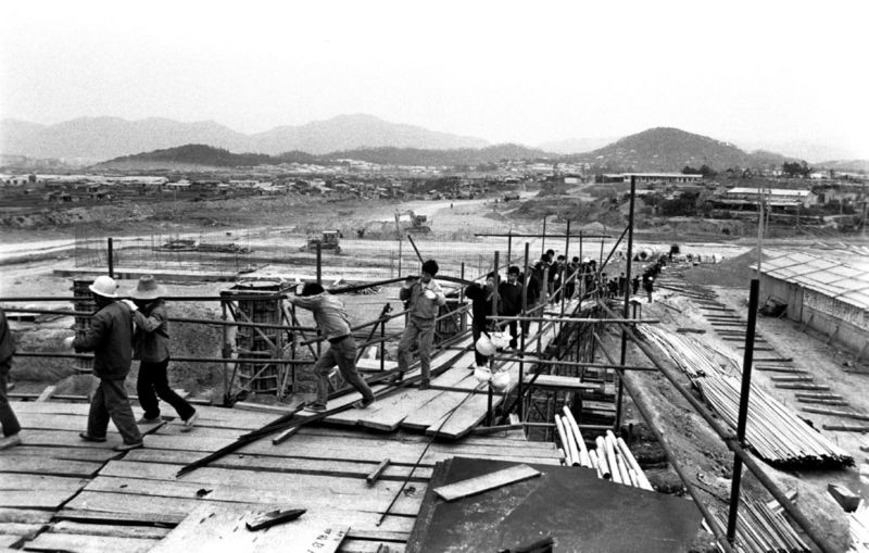 1985年,建設(shè)者們?cè)谏钲诨疖囌救诵刑鞓蚴┕ぁ蜗钄z