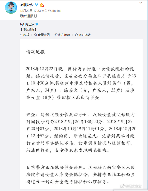 8歲女童遭家暴事件最新消息是,深圳警方對此展開了調(diào)查處理。寶安區(qū)婦聯(lián)已向?qū)毎矃^(qū)人民法院申請女童人身安全保護(hù)令。寶安公安局的調(diào)查結(jié)果顯示,網(wǎng)上流傳的3分鐘視頻分別是今年9月、10月的四個時間段拍攝,女童父母對毆打女兒的事實供認(rèn)不諱,法醫(yī)檢查女童體表未發(fā)現(xiàn)明顯傷痕。