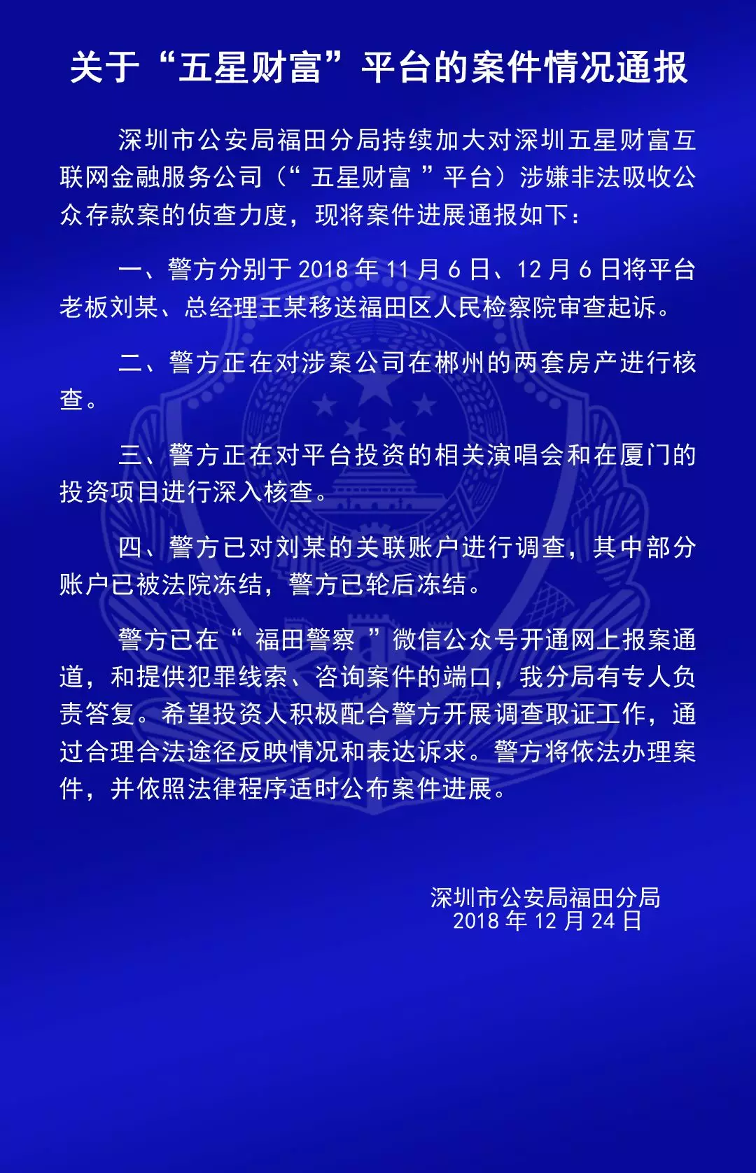 關(guān)于“合拍在線”“壹佰金融”“五星財(cái)富”“眾車在線”“財(cái)富中國”“小零錢”“錢爸爸”“合時(shí)代”和“前金融”平臺的案情通報(bào)