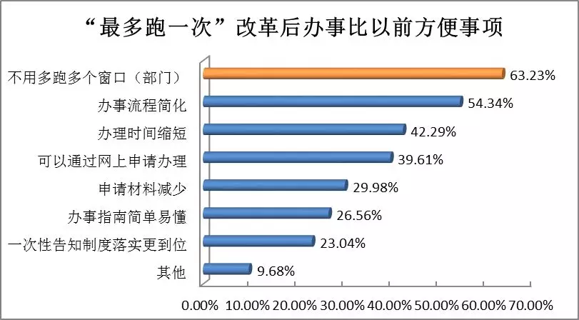 86.69%的受訪者認(rèn)為“最多跑一次”改革實(shí)施后到政府辦事比以前更方便了,方便事項(xiàng)排在第一位的是“不用多跑多個(gè)窗口(63.23%),其次依次為辦事流程簡(jiǎn)化(54.34%)、辦理時(shí)間縮短(42.29%)。