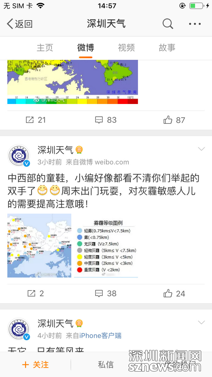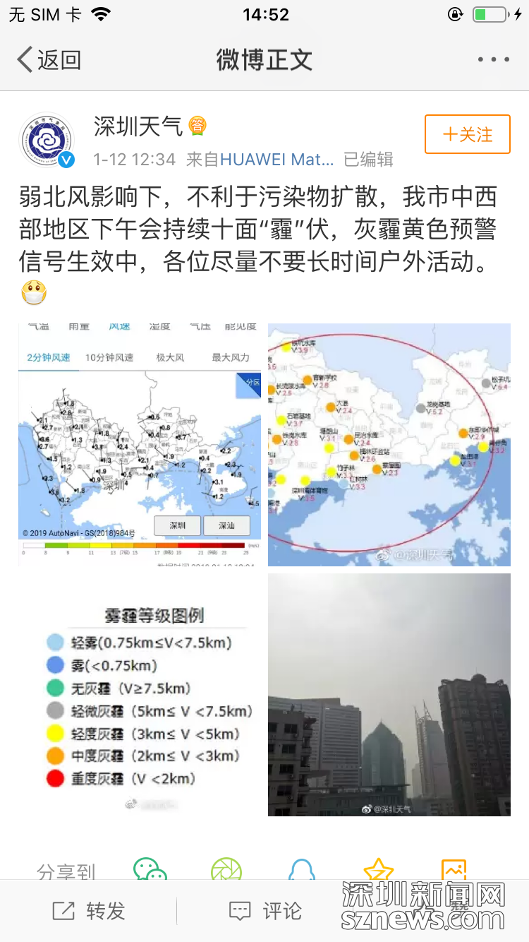 1月12日中午,深圳天氣微博發(fā)布預警,圖中橙色圓點所在的深圳多個片區(qū)發(fā)生中度灰霾