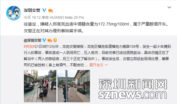 深圳一跑車沖向人行道致1死5傷 肇事司機嚴重醉駕