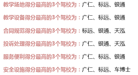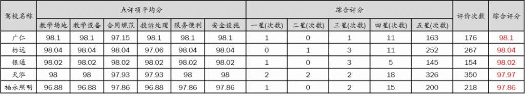 學(xué)員對(duì)駕校打分平均分為95.74分(滿(mǎn)分100分),與第三季度95.71分基本持平。其中,綜合評(píng)分最高的前5名駕校分別為:廣仁、標(biāo)遠(yuǎn)、銀通、天泓、福永照明。