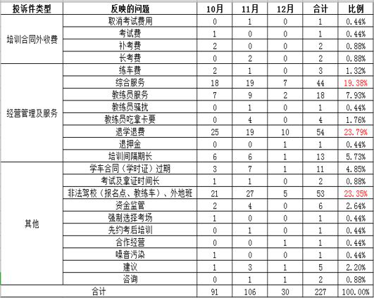 第四季度投訴主要集中在退學(xué)退費(fèi)、非法駕校(報(bào)名點(diǎn)、教練車(chē))、外地班等問(wèn)題。學(xué)員與不合規(guī)范的駕校、外地班產(chǎn)生的矛盾是本季度產(chǎn)生投訴的主要原因;此外,還有部分學(xué)員反映綜合服務(wù)等問(wèn)題。