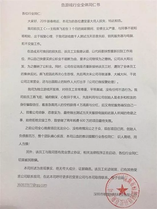 1月20日,深圳市螃蟹網(wǎng)絡科技有限公司創(chuàng)始人尹柏霖發(fā)文控訴,前員工燕某在游戲上線測試當天(2017年12月15日),鎖死服務器與電腦,并惡意失蹤,致公司損失慘重。尹柏霖稱,“我們上線不了也測試不了,等新員工到職后熟悉新代碼又是幾個月過去了?!?/p>