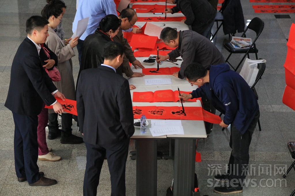 過年貼春聯(lián),是中華民族的傳統(tǒng)習(xí)俗之一??梢哉f,春聯(lián)一出,年味十足。記者在深圳商報(bào)大廈一樓活動(dòng)現(xiàn)場(chǎng)看到,工作人員早已準(zhǔn)備好了春聯(lián)的紅紙和筆墨,多位書法了得的記者編輯揮毫潑墨,創(chuàng)作出了一幅幅寓意喜慶吉祥的對(duì)聯(lián),并免費(fèi)贈(zèng)送給同事。不少人為了能拿到新鮮出爐的春聯(lián),提前在現(xiàn)場(chǎng)排隊(duì)等候。