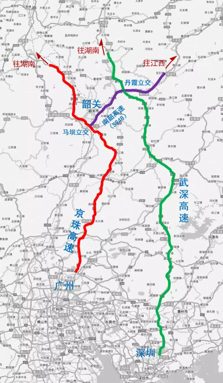 建議3:沿G4京港澳高速北上后,在韶關(guān)馬壩樞紐轉(zhuǎn)南韶高速往東,至丹霞樞紐進0入仁新高速,經(jīng)九龍江省際收費站進入湖南,沿S11平汝高速北上。該線路是前往長株潭城市群、武漢、南昌等地的最佳路徑。