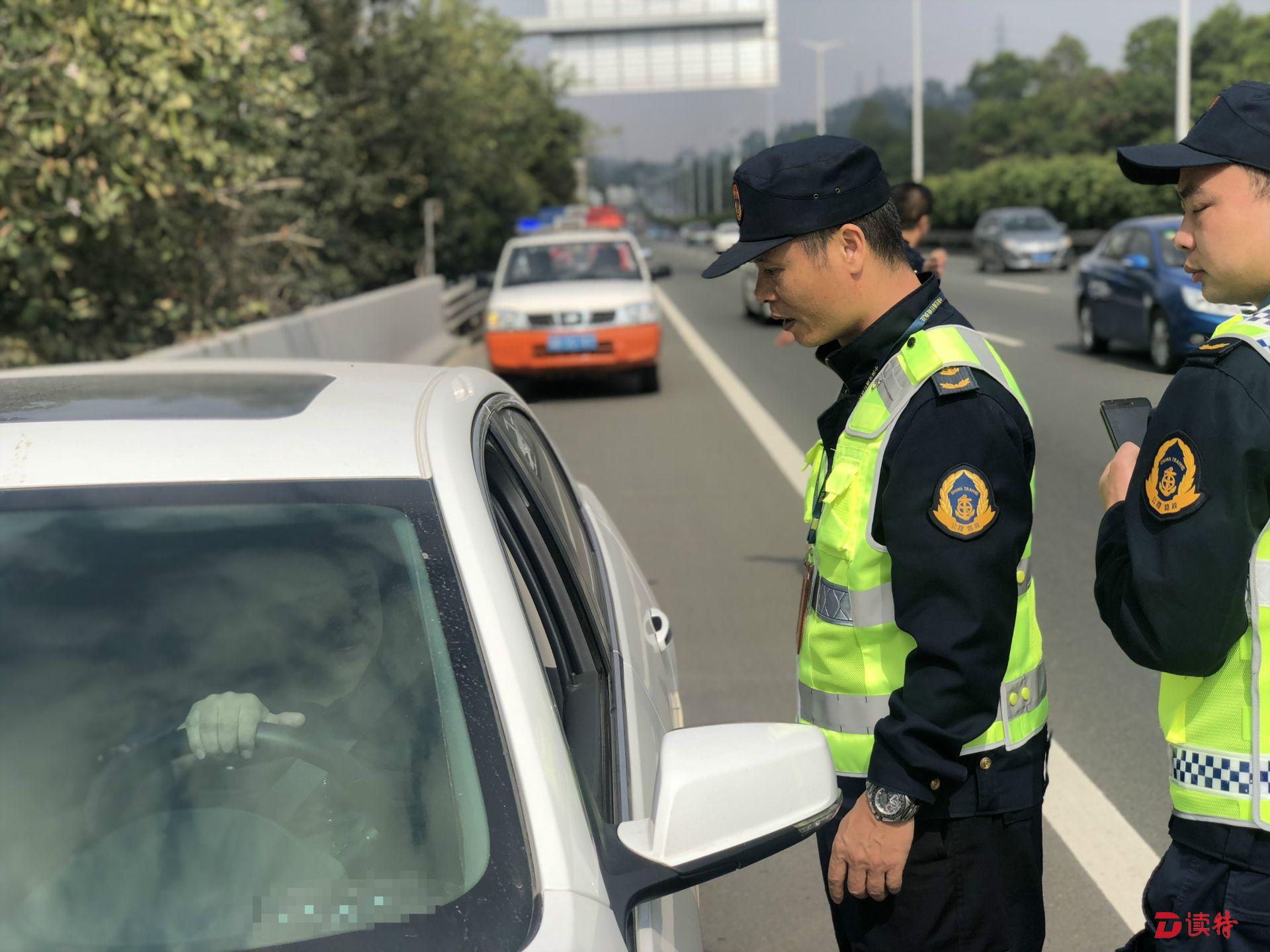 11:20,南光高速光明路段路邊應(yīng)急車道上,有一輛小車???。馬明海和開車的老林一起下車,走過(guò)去詢問(wèn)。原來(lái)這輛小車爆胎了,正在等待維修廠送備胎過(guò)來(lái)。馬明海讓車內(nèi)司機(jī)和乘客趕緊下車,盡量往路邊站?!耙郧案咚俟飞铣鲞^(guò)這樣的事故,小車拋錨后,車主沒(méi)有下車,結(jié)果后面的車輛沒(méi)注意撞上來(lái),車內(nèi)的人都沒(méi)了?!崩狭盅a(bǔ)充道:“下車后也不能站在車前或車后,這些位置都很危險(xiǎn),最好站到高速護(hù)欄的外面去等待救援?!笨吹綊佸^車輛后面只放了一個(gè)很小的三角架,馬明海回到巡檢車上,拿下來(lái)兩個(gè)反光錐放到小車后:“一定要讓其他車輛能很遠(yuǎn)就看到這里有車輛??浚f(wàn)不能發(fā)生二次事故?!?/p>