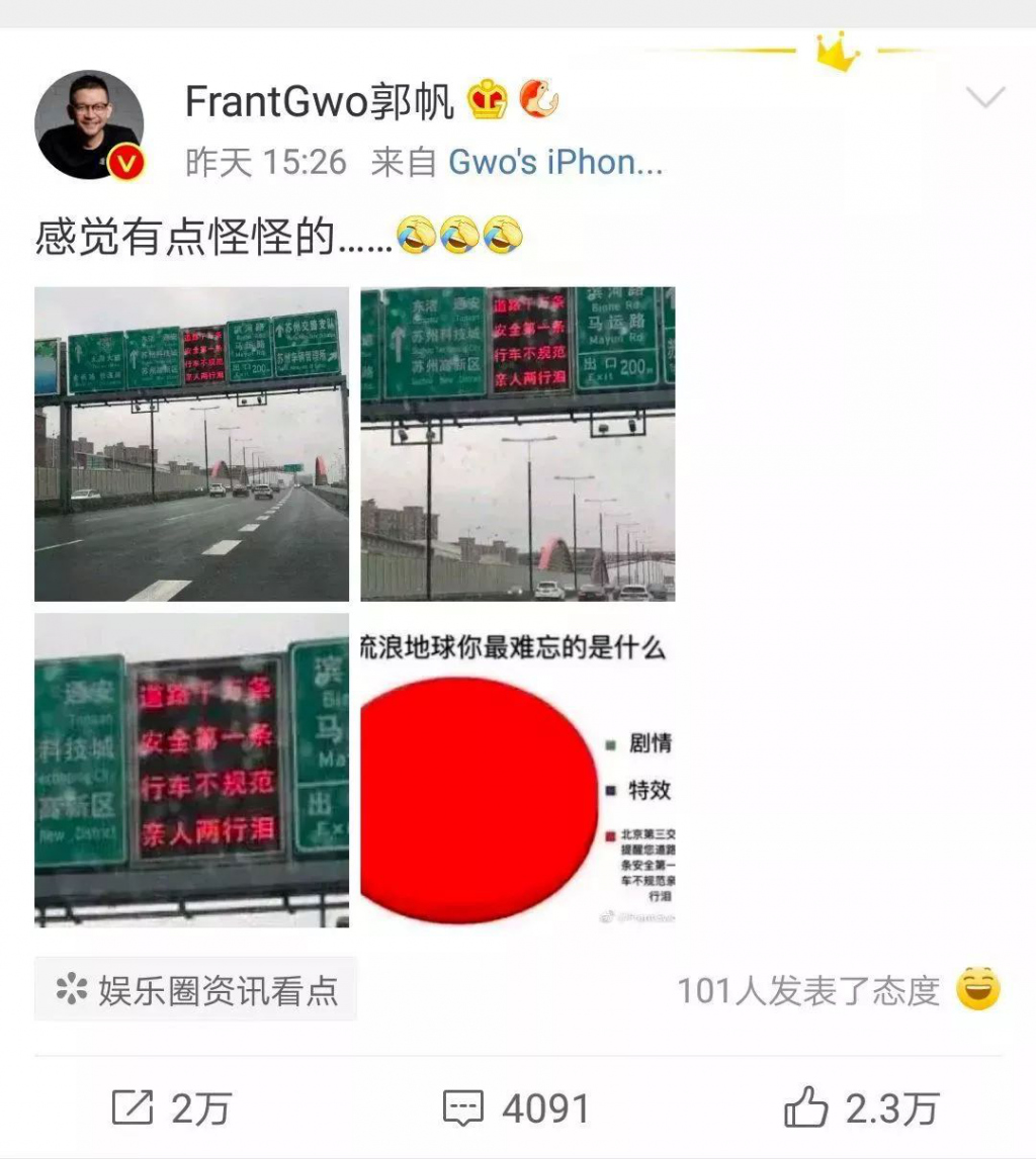 這些現(xiàn)實中的畫面,也把導演"驚動"了,郭帆導演發(fā)微博表示有點怪怪的。