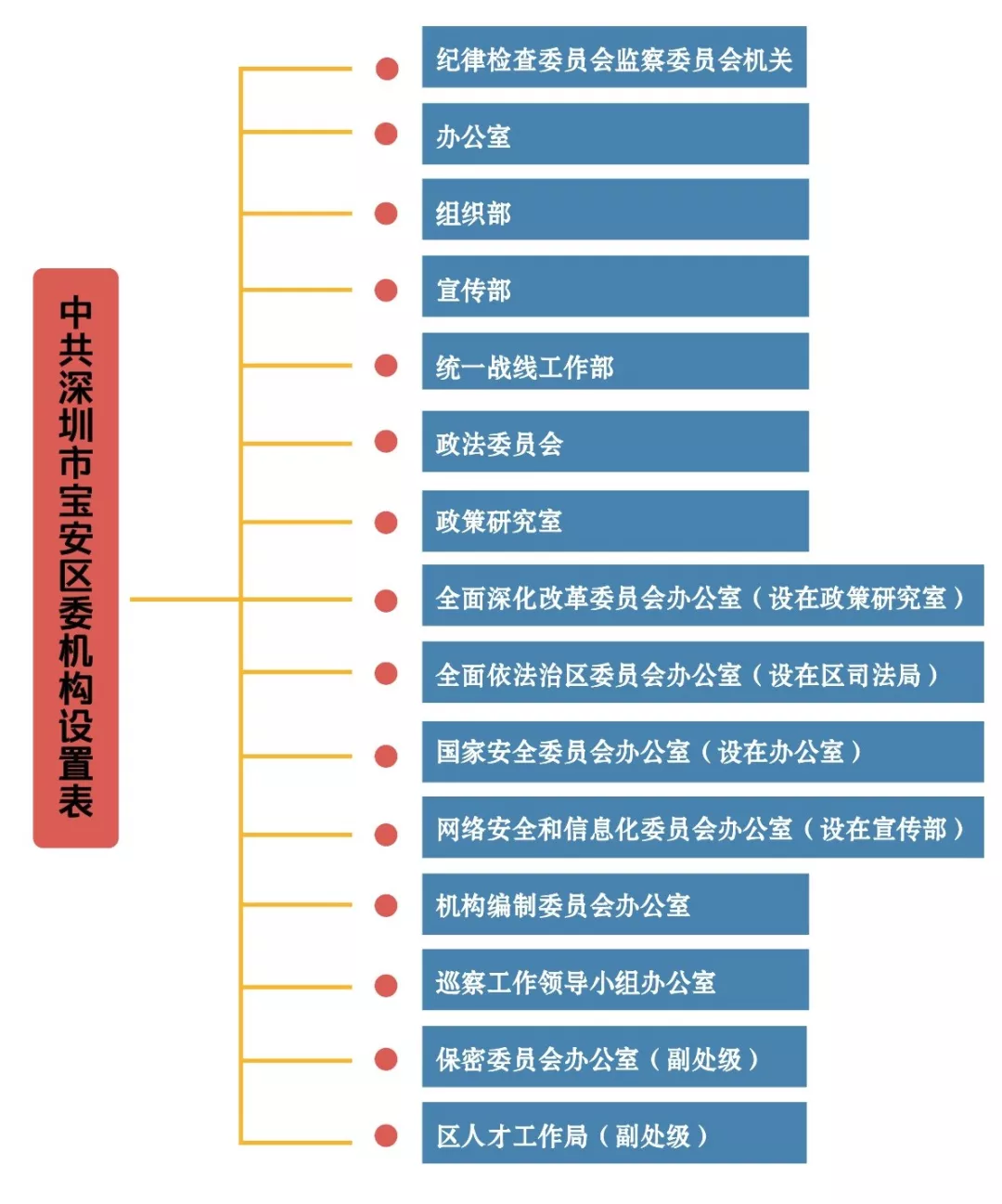說明:深圳市寶安區(qū)委設置紀檢監(jiān)察機關1個,計入機構限額的工作機關10個(設在相關部門的區(qū)委議事協(xié)調機構的辦事機構不計入機構限額)。其中,紀律檢查委員會與監(jiān)察委員會合署辦公,實行一套工作機構、兩個機關名稱;辦公室掛區(qū)外事局、區(qū)檔案局牌子;組織部掛區(qū)直屬機關工作委員會、區(qū)非公有制經濟組織和社會組織工作委員會、區(qū)公務員局牌子;宣傳部掛區(qū)精神文明建設委員會辦公室、區(qū)新聞出版局、區(qū)互聯(lián)網(wǎng)信息辦公室牌子;統(tǒng)一戰(zhàn)線工作部掛區(qū)民族宗教事務局、區(qū)臺港澳事務局、區(qū)僑務局牌子;保密委員會辦公室掛機要局、區(qū)國家保密局、區(qū)密碼管理局牌子。