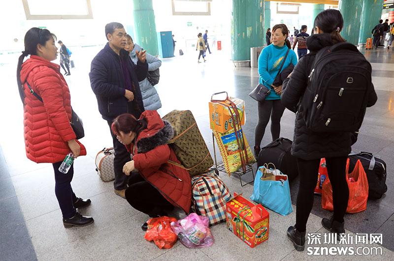 不少旅客攜帶當?shù)厮约凹亦l(xiāng)特產(chǎn)返回深圳,圖中這一家人下車后整理行李