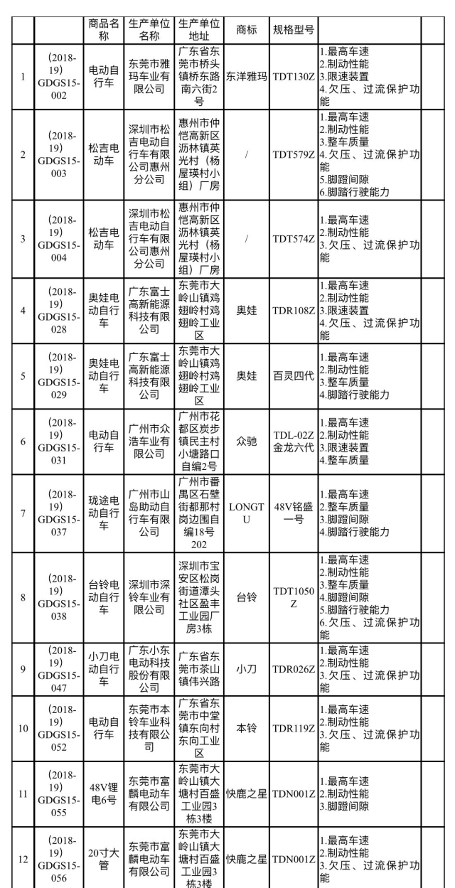 南方網(wǎng)2019年2月14日訊 2月13日,廣東省市場監(jiān)督管理局發(fā)布2018年度流通領(lǐng)域電動(dòng)自行車(含電池和充電器)商品質(zhì)量抽查檢驗(yàn)結(jié)果,60款電動(dòng)自行車(含充電器)監(jiān)督總體不合格。其中,電動(dòng)自行車31款不合格,電動(dòng)自行車充電器29款不合格,愛瑪、臺(tái)鈴、東洋雅瑪、奧娃等品牌紛紛上榜。