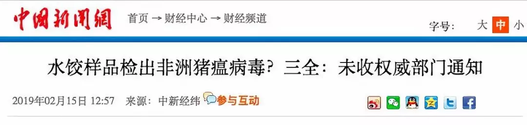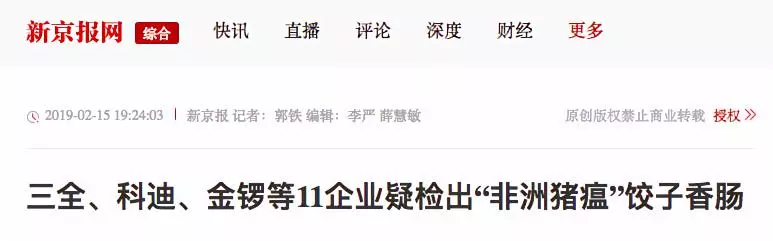據(jù)紅星新聞報(bào)道,多家媒體稱,2月9日,湖南省湘西自治州重大動(dòng)物疫病防制指揮部辦公室接到省防治重大動(dòng)物疫病指揮部辦公室通知,要求瀘溪縣重大動(dòng)物疫病防制指揮部辦公室對(duì)來源于吉首市凌云冷凍食品批發(fā)部?jī)鰩斓漠a(chǎn)品進(jìn)行抽樣,在瀘溪縣好又多和萬家福兩家超市共抽取4個(gè)批次12份樣品,經(jīng)州動(dòng)物疫病預(yù)防控制中心檢測(cè),其中由河南三全食品有限公司生產(chǎn)批次為20190113H的“三全灌湯水餃”3份樣品為非洲豬瘟病毒核酸陽性。