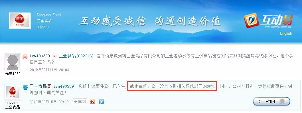 中新經(jīng)緯客戶端報(bào)道,14日晚間,有投資者在深交所互動(dòng)平臺(tái)上提問三全食品稱,有消息稱三全灌湯水餃有三份樣品被檢測(cè)出非洲豬瘟病毒核酸陽性,該事件是否真實(shí)?