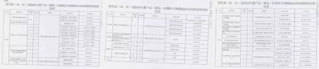 除速凍食品外,該網(wǎng)友發(fā)帖顯示,標(biāo)稱河南省長(zhǎng)隆食品有限責(zé)任公司、濟(jì)南康利斯食品有限公司、山東齊匯食品有限公司、山東臨沂金鑼文瑞食品有限公司、河南惠萬家食品有限公司、合肥市凱樂斯食品有限公司生產(chǎn)的培根、香腸、火腿腸等個(gè)別批次產(chǎn)品樣品,也被檢出非洲豬瘟病毒核酸陽性。