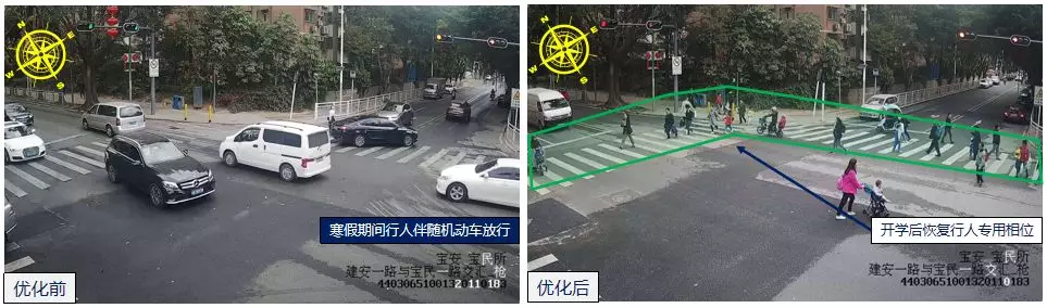 春季開學(xué),清林路/龍?zhí)堵房诘嚷房诨謴?fù)上下學(xué)期間行人專用相位,在學(xué)生過街需求大的時段,運行行人專用相位,分離人、車交織,保障學(xué)生過街安全。
