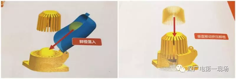 經(jīng)監(jiān)管人員調(diào)取相關(guān)技術(shù)圖紙,確認(rèn)這兩個(gè)碗狀的金屬部件就是“上下爪”,大部分材質(zhì)為鋁合金,是榨取橙汁的核心部件,通過垂直合攏上下爪,對(duì)兩爪之間的橙子施加壓力,擠出的橙汁經(jīng)由橙子下方的孔洞流入不銹鋼儲(chǔ)汁桶,再經(jīng)由導(dǎo)流管將橙汁注入紙杯內(nèi),售賣給消費(fèi)者。