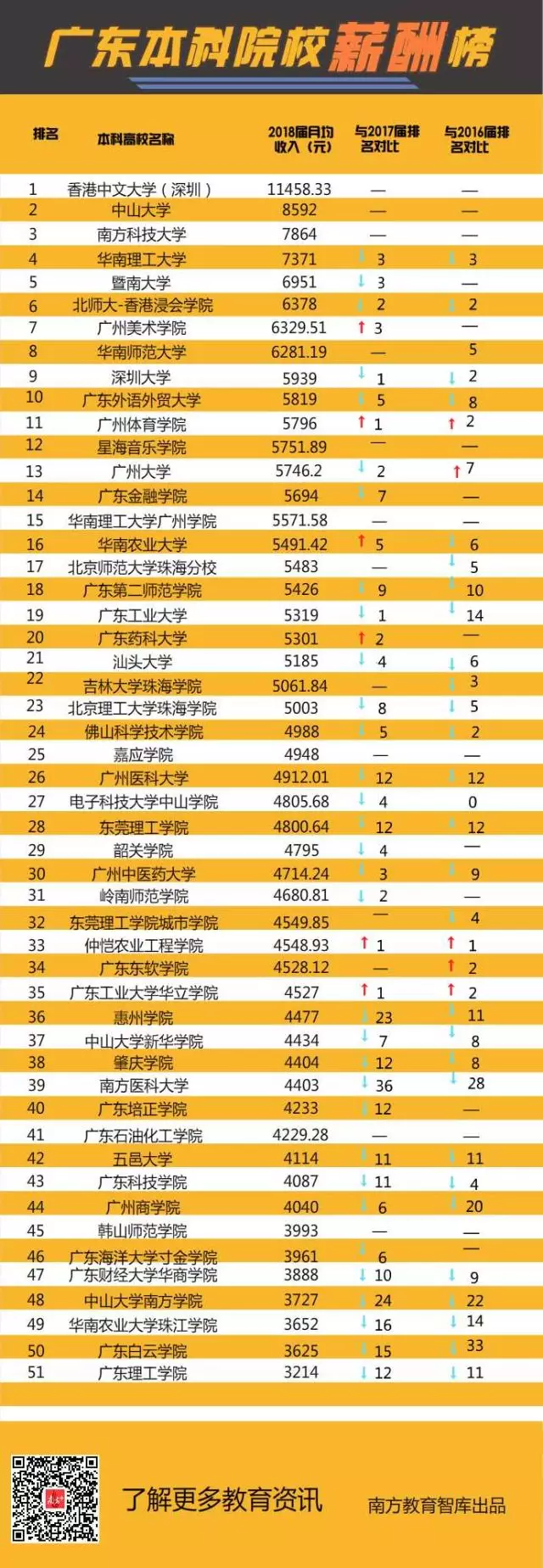 不久前,省教育廳發(fā)布了《2018年高校畢業(yè)生就業(yè)質(zhì)量年度報(bào)告》,全省本科畢業(yè)生平均月薪為4522元。已公布相關(guān)數(shù)據(jù)的51所本科高校中,有35所超過了全省本科畢業(yè)生的平均月薪,其中中山大學(xué)8592元、南方科技大學(xué)7864元、華南理工大學(xué)7371元名列前3位,均超過7000元。