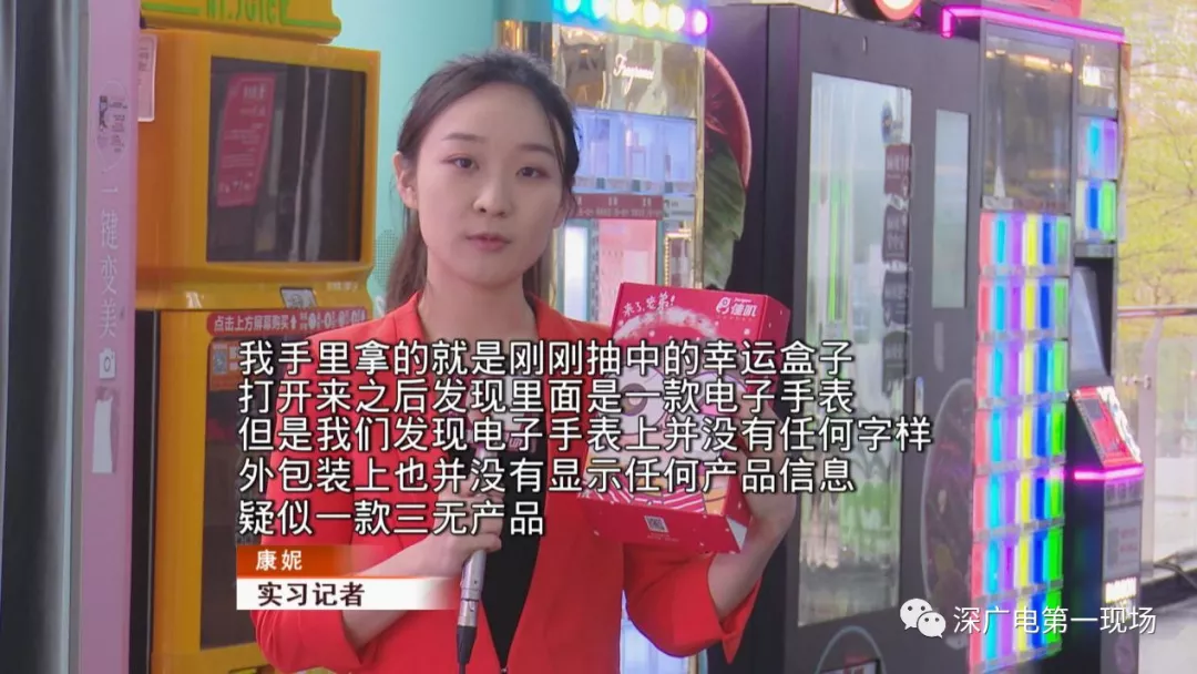 記者注意到,這家商場里擺放的除了口紅機(jī)外,還有所謂的“幸運(yùn)禮盒”機(jī),這個機(jī)器外型與自動售貨機(jī)相似,游戲規(guī)則更加簡單粗暴,只要掃碼付款三十元,就能得到一個幸運(yùn)禮盒。但禮盒里的獎品卻讓記者大跌眼鏡。