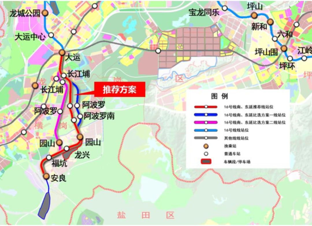 16號線南延對于支持重點(diǎn)產(chǎn)業(yè)區(qū)發(fā)展、強(qiáng)化龍崗中心城與橫崗、鹽田的區(qū)域聯(lián)系、構(gòu)筑城際樞紐具有重要意義。線路從大運(yùn)站引出,沿龍崗大道敷設(shè),轉(zhuǎn)入長江埔路并設(shè)長江埔站,然后向南進(jìn)入阿波羅產(chǎn)業(yè)園并設(shè)阿波羅站,繼續(xù)向南進(jìn)入阿波羅產(chǎn)業(yè)區(qū)并設(shè)阿波羅南站,向南進(jìn)入萬福路并設(shè)園山站,然后沿公園路敷設(shè),轉(zhuǎn)入沙荷路在沙荷路與龍興路交叉口設(shè)龍興站,在沙荷路與安業(yè)路交叉口設(shè)??诱荆詈笱鼗蓰}中路進(jìn)入安良村,設(shè)終點(diǎn)站安良站。線路全長約7.8km,采用地下敷設(shè)。