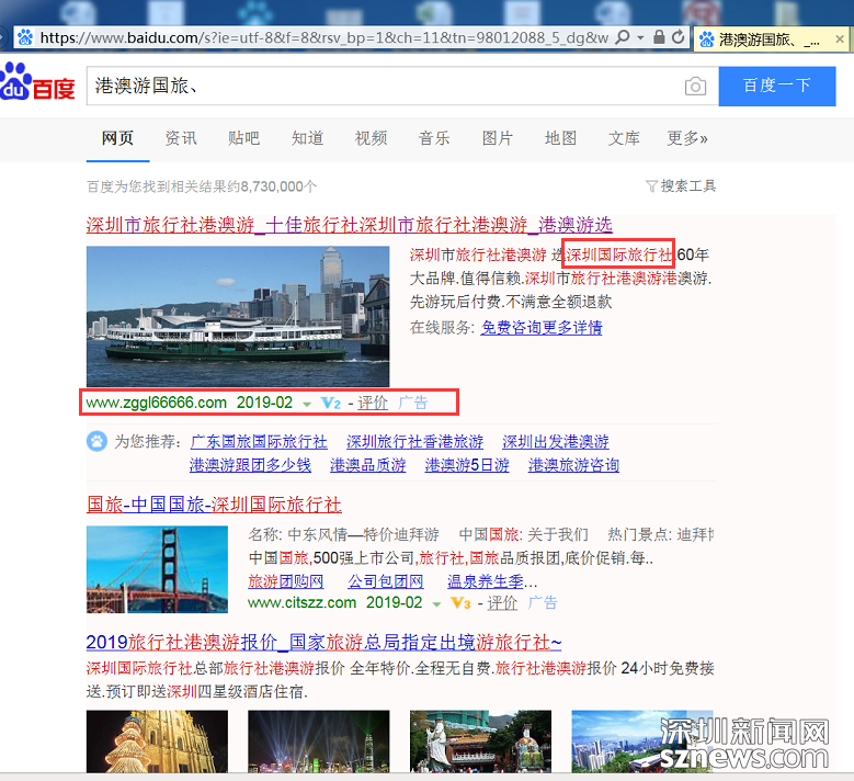 深圳市消委會模擬消費者網(wǎng)絡(luò)搜索實際使用場景,在百度搜索中搜索“港澳游國旅”等關(guān)鍵詞,進(jìn)行了專項測試調(diào)查。調(diào)查發(fā)現(xiàn),搜素“港澳游國旅”等關(guān)鍵詞時搜索頁面會出現(xiàn)加V等級認(rèn)證的旅行社廣告信息,但經(jīng)核實,“深圳信用網(wǎng)”商事主體登記信息中并無該企業(yè)。