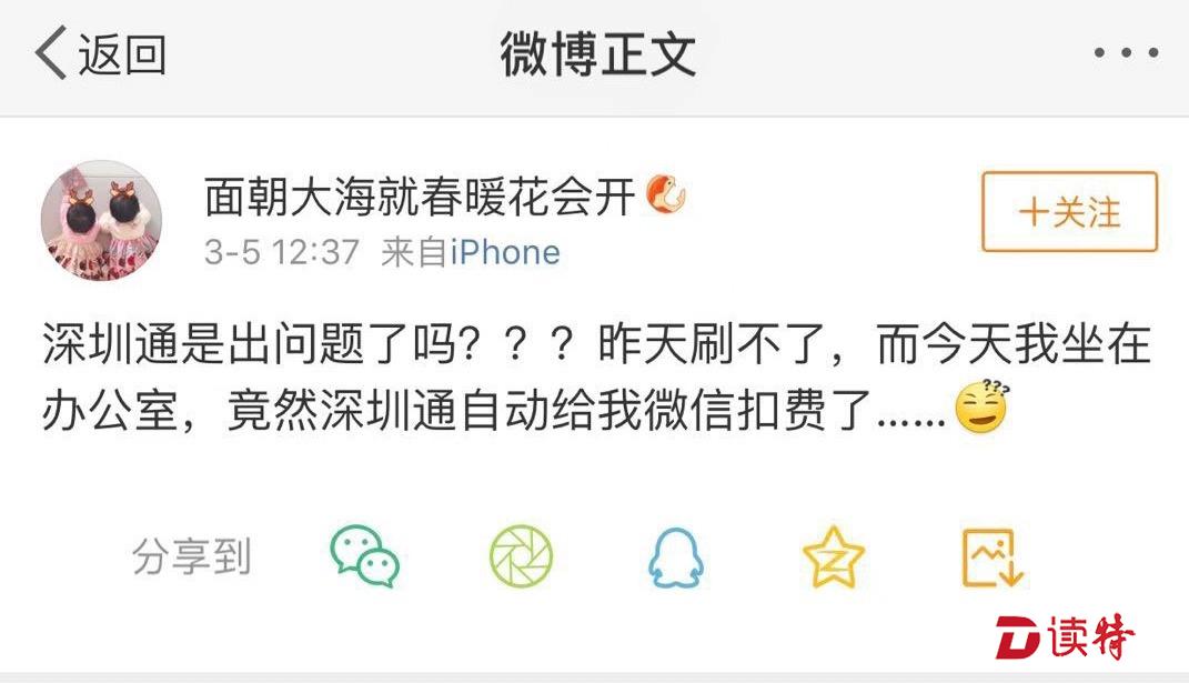 據(jù)微博網(wǎng)友“@面朝大海就春暖花會開”反映,3月5日中午,自己坐在辦公室還被“深圳通+”小程序微信扣費。市民何先生也致電本報說,“中午12點30分左右,自己坐312公交車,用微信深圳通小程序刷卡,被重復扣費一次,聯(lián)系深圳通公司無人接聽?!?/p>