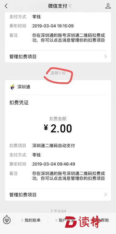 5日中午,記者再次使用“深圳通+”小程序支付車費(fèi),掃碼后隨即收到一條“1.6元”的付款信息,過(guò)了不到5分鐘又收到了一條“1.6元”的扣費(fèi)信息,但乘車時(shí)間顯示為“3月4日”。這是否是重復(fù)扣費(fèi)呢?