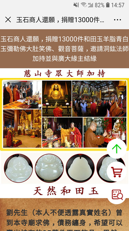 "劉先生(本人不便透露真實(shí)姓名)曾到本寺廟求佛,債務(wù)纏身,希望可以賣出持有的35萬件玉石飾品,果然三個月左右被大陸采購商出價3000多萬人民幣買走,償還完所有債務(wù)后,男子便帶著剩余的13000多件庫存玉器到寺廟還愿......"