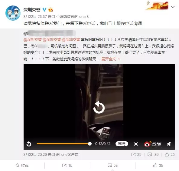 “舉報啊舉報啊?。?!大巴車三次差點出車禍!司機一路搖頭晃腦摸鼻子!?。?!”3月22日晚,深圳交警在微博上接到網(wǎng)友舉報。