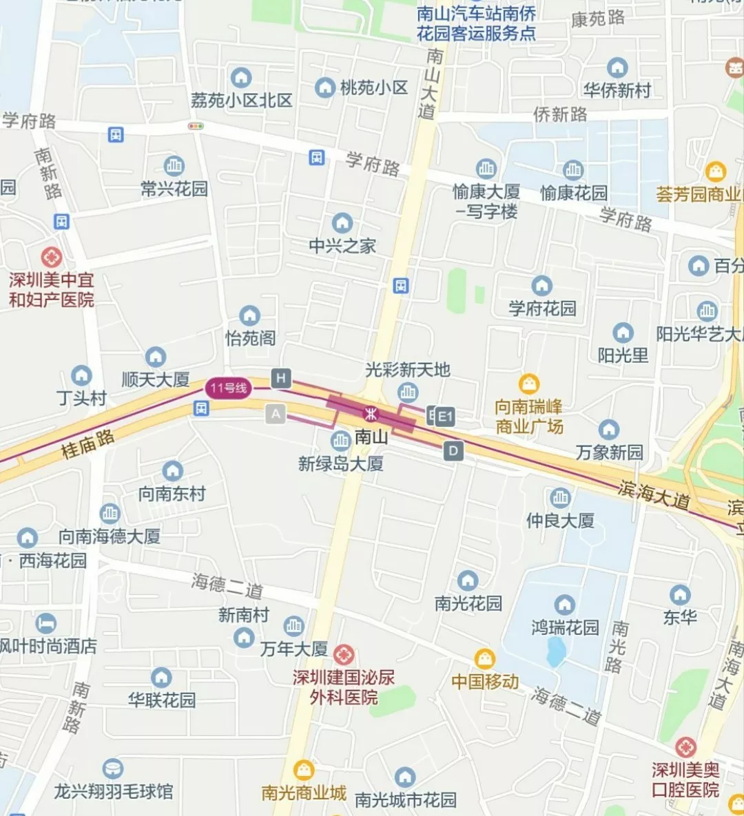 南山站總共有5個出入口,A口位于南山大道南側(cè)、桂廟路西側(cè),需要乘車的市民請從D口、H口、E1口、E2口進站乘車。