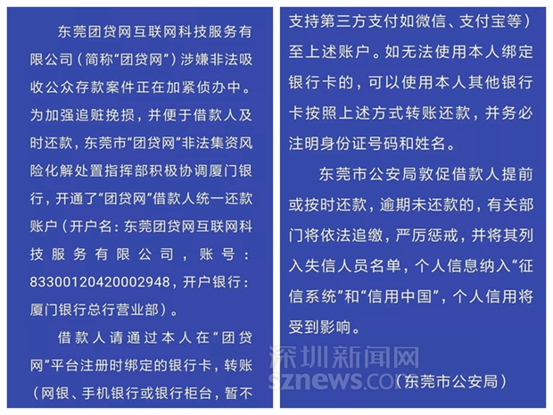 東莞警方開(kāi)設(shè)統(tǒng)一還款賬戶敦促“團(tuán)貸網(wǎng)”借款人還款