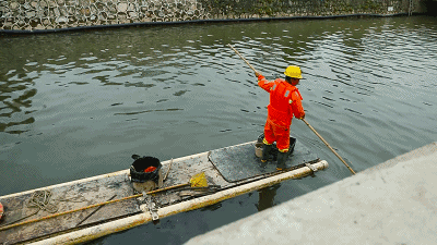 耐心清理河面上細(xì)小的垃圾