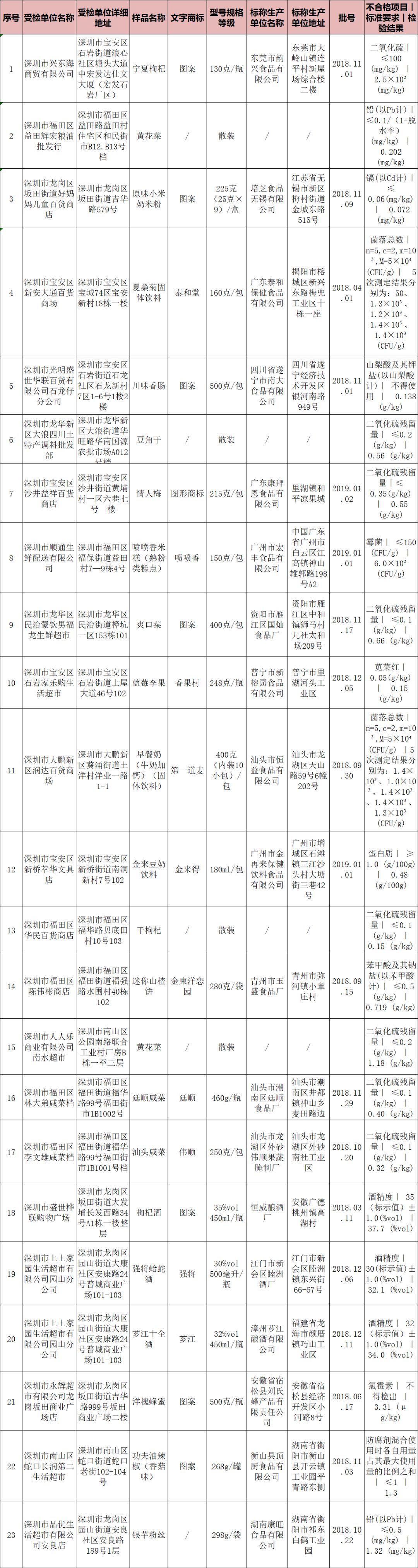 本次共抽檢流通環(huán)節(jié)食品2131批次,涉及流通環(huán)節(jié)經(jīng)營主體529家次,共檢測食品指標(biāo)13373項(xiàng)次。其中檢出不合格樣品23批次,涉及不合格食品類別有茶葉及相關(guān)制品1批次,淀粉及淀粉制品1批次,蜂產(chǎn)品1批次,糕點(diǎn)1批次,酒類3批次,肉制品1批次,蔬菜制品6批次,水果制品4批次,特殊膳食食品1批次,調(diào)味品1批次,飲料3批次;涉及不合格項(xiàng)目類別為獸藥殘留、金屬等元素污染、微生物污染、食品添加劑、品質(zhì)指標(biāo)。