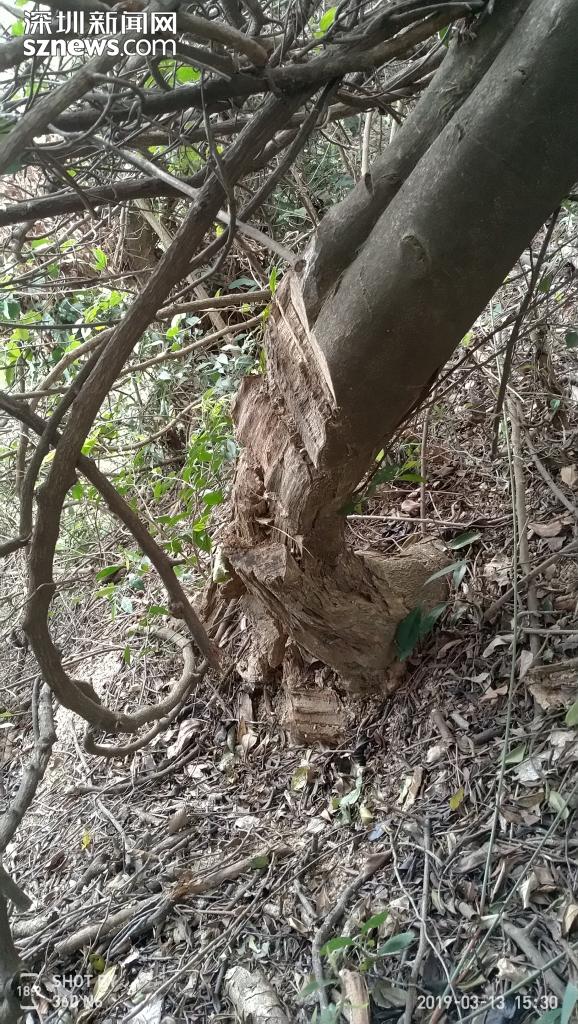 該網(wǎng)友提及的應人石村位于深圳石巖,從地圖上看,其“后山”與羊臺山森林公園連為一體,是附近居民閑暇時度假踏青的重要選擇。據(jù)了解,網(wǎng)友“詩奴L”于今年3月中旬上山游玩,游玩途中發(fā)現(xiàn)原本茂盛的野生沉香樹大多遭人砍伐?!安环ǚ肿痈F盡一切手段,用鉆、削、劈、鋸等來對沉香樹進行摧殘,這簡直是屠殺式的洗劫!”該網(wǎng)友表示,看到這么多野生沉香樹被殘暴砍伐,真地讓人很氣憤。