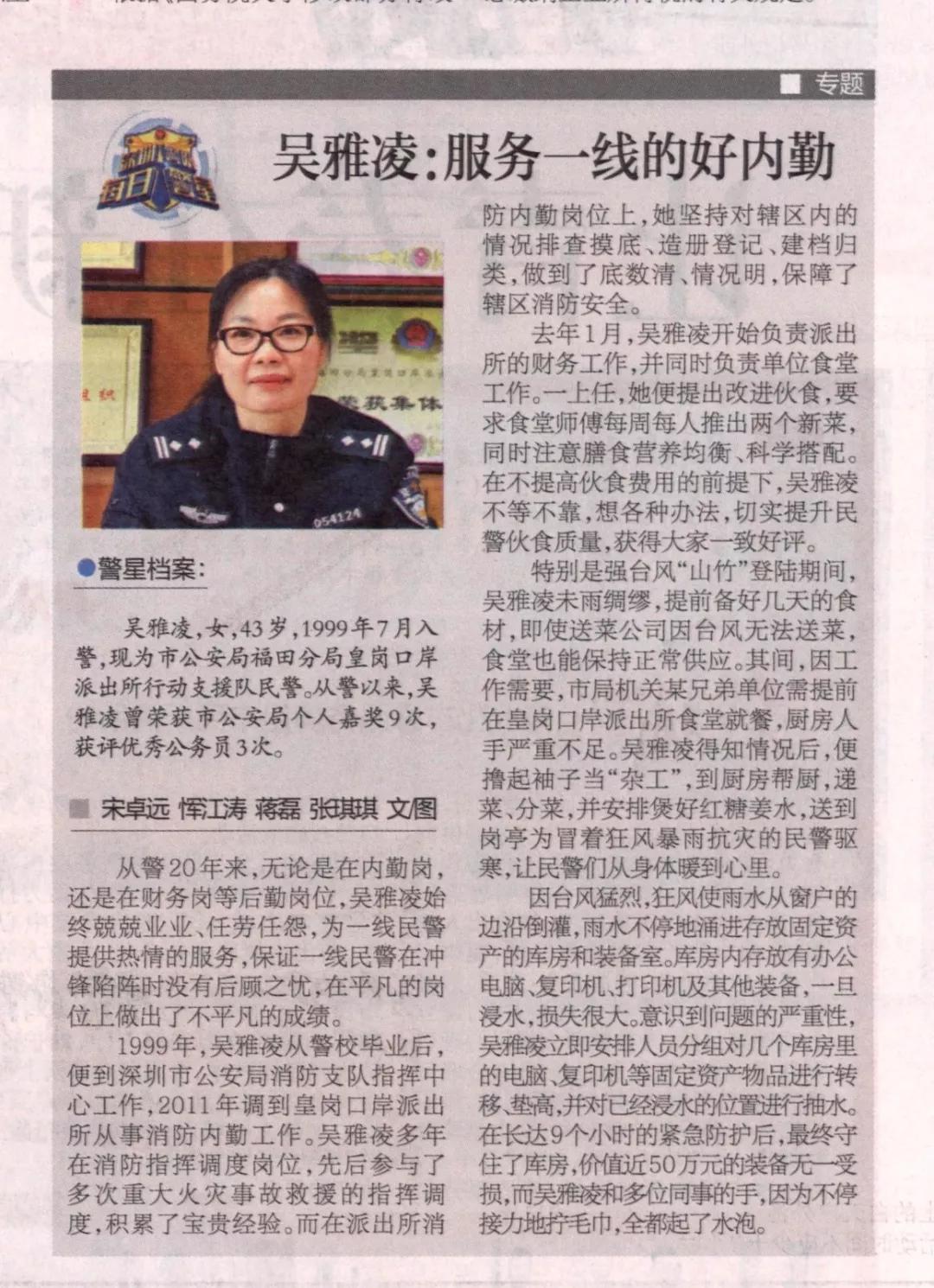 從警20年來,無論是在內(nèi)勤崗,還是在財務(wù)崗等后勤崗位,吳雅凌始終兢兢業(yè)業(yè)、任勞任怨,為一線民警提供熱情的服務(wù),保證一線民警在沖鋒陷陣時沒有后顧之憂,在平凡的崗位上做出了不平凡的成績。