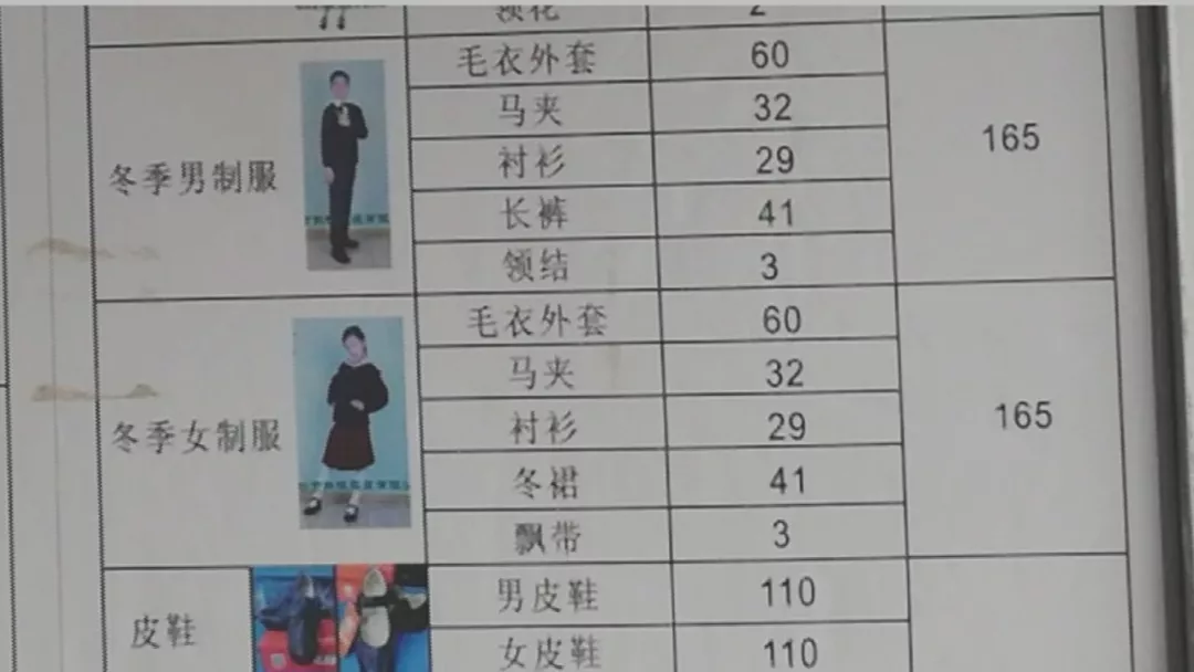 從龐女士發(fā)過來的圖片中記者看到,此前這家店的校服價格表中,小學(xué)學(xué)生冬季制服價格為165元。