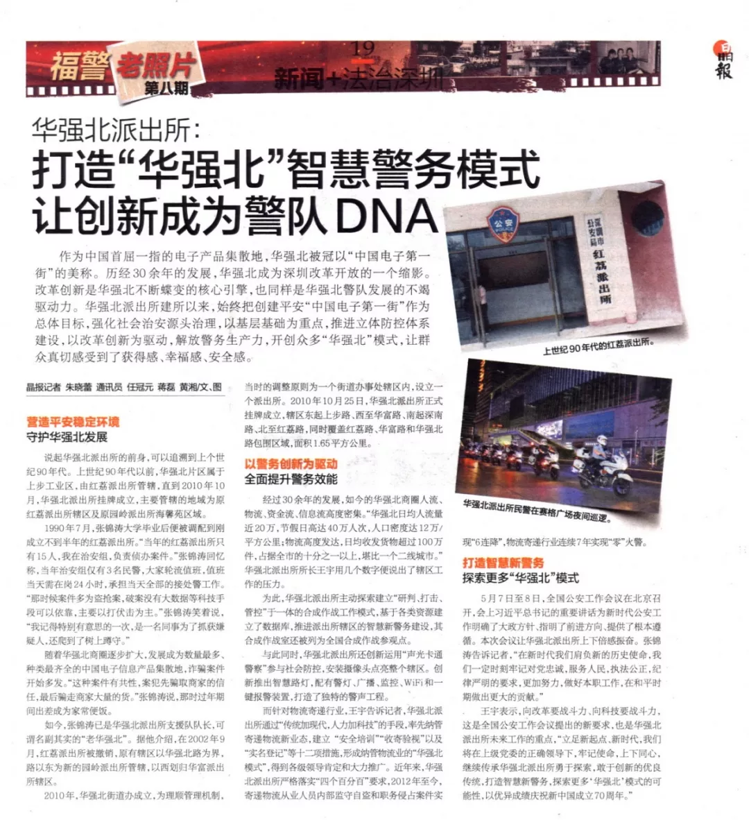 如今,張錦濤已是華強(qiáng)北派出所支援隊(duì)隊(duì)長(zhǎng),可謂名副其實(shí)的“老華強(qiáng)北”。據(jù)他介紹,在2002年9月,紅荔派出所被撤銷,原有轄區(qū)以華強(qiáng)北路為界,路以東為新的園嶺派出所管轄,以西劃歸華富派出所轄區(qū)。