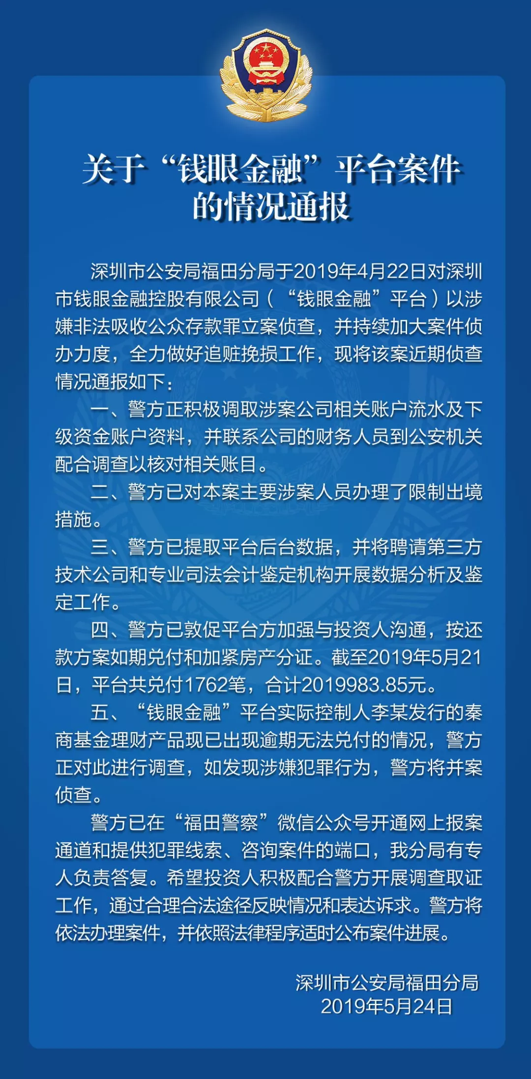 關(guān)于“錢眼金融”平臺(tái)的案件情況通報(bào)