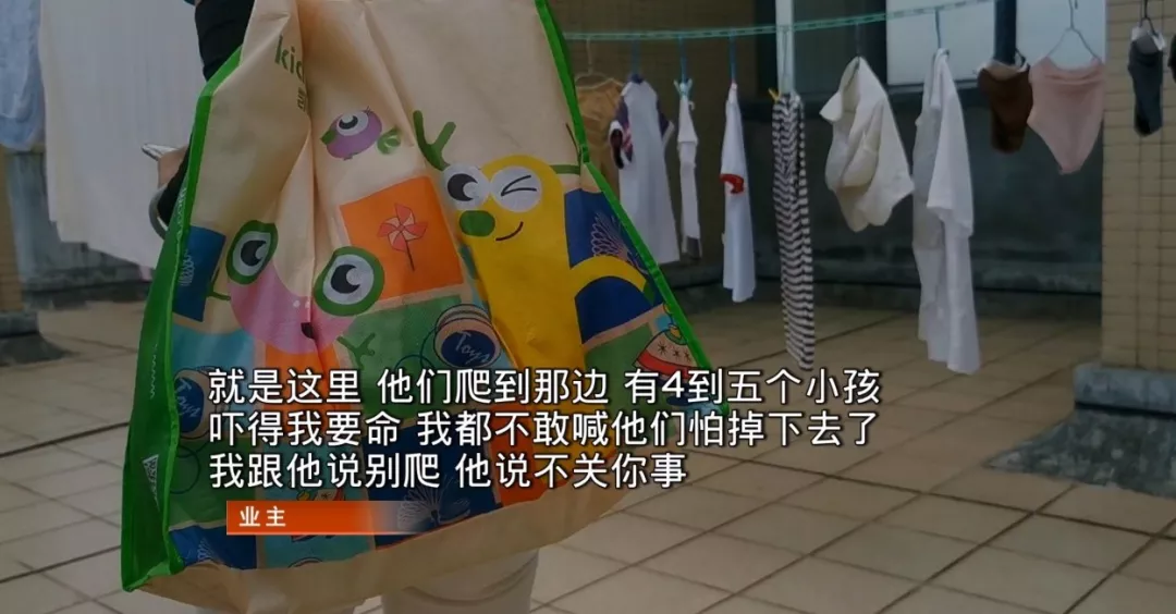就在上周六,她親眼看到四五個孩子在天臺上四處攀爬,玩槍戰(zhàn),攔都攔不住。