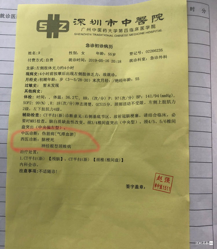 劉女士告訴記者,其事先已告知店家自己曾有過腦震蕩,但店家稱可以進(jìn)行按摩。"按摩師是用胳膊的紂關(guān)節(jié)大力按壓我的左側(cè)頸椎脖子部位,我痛得受不了,但按摩師表示痛就是刺激穴位。"大約20多分鐘左右后,劉女士左手左腰左腿開始麻木動不了,人不能翻身。