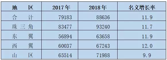 城鎮(zhèn)非私營單位的排名則為珠三角、山區(qū)、西翼、東翼,分別是93240元、71988元、67243元和63658元;同比名義增長率從高到低依次為西翼12.0%、東翼11.9%、珠三角11.7%和山區(qū)9.9%。最高和最低區(qū)域的平均工資之比為1.46,比上年縮小0.01。