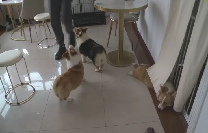 根據(jù)小區(qū)業(yè)主指引,記者來(lái)到小區(qū)13層的一家狗狗咖啡廳,可以看到,門口并沒有任何招牌,不過大門打開后,可以看到經(jīng)營(yíng)場(chǎng)所有兩層,里面有餐桌凳子,有收銀臺(tái),另外還有四只小型寵物犬。