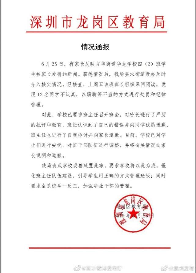 深圳新聞網(wǎng)2019年6月26日訊 近日,關(guān)于深圳一小學(xué)班長對同學(xué)拳打腳踢的輿情網(wǎng)上熱傳?記者26日從龍崗區(qū)教育局獲悉,該班班長確實對12名學(xué)生以踢腳等不當(dāng)方式進行紀(jì)律管理。事情發(fā)生后,學(xué)校已對該班班長進行了嚴(yán)厲的批評教育,該班班主任也進行自我檢討和道歉。目前,學(xué)校已對學(xué)生進行安撫,對班干部隊伍進行了調(diào)整。