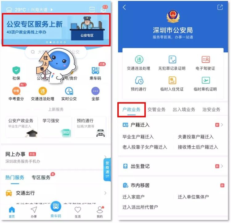 同時(shí),市民也可從“深圳公安”微信公眾號(hào)菜單欄,進(jìn)入“民生”欄目中的“戶政業(yè)務(wù)”板塊,在線辦理上述服務(wù)。