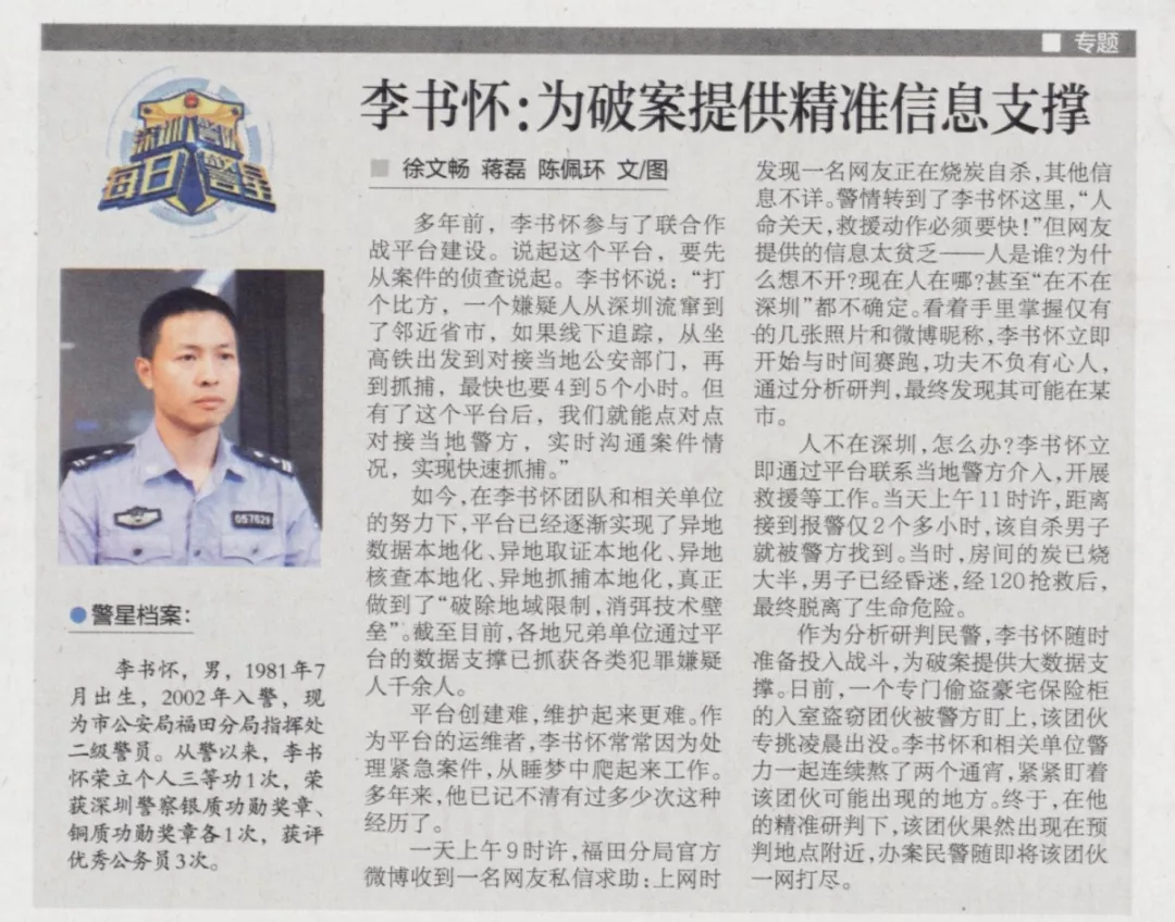 多年前,李書懷參與了聯(lián)合作戰(zhàn)平臺(tái)建設(shè)。說(shuō)起這個(gè)平臺(tái),要先從案件的偵查說(shuō)起。李書懷說(shuō):“打個(gè)比方,一個(gè)嫌疑人從深圳流竄到了鄰近省市,如果線下追蹤,從坐高鐵出發(fā)到對(duì)接當(dāng)?shù)毓膊块T,再到抓捕,最快也要4到5個(gè)小時(shí)。但有了這個(gè)平臺(tái)后,我們就能點(diǎn)對(duì)點(diǎn)對(duì)接當(dāng)?shù)鼐剑瑢?shí)時(shí)溝通案件情況,實(shí)現(xiàn)快速抓捕?!?/p>