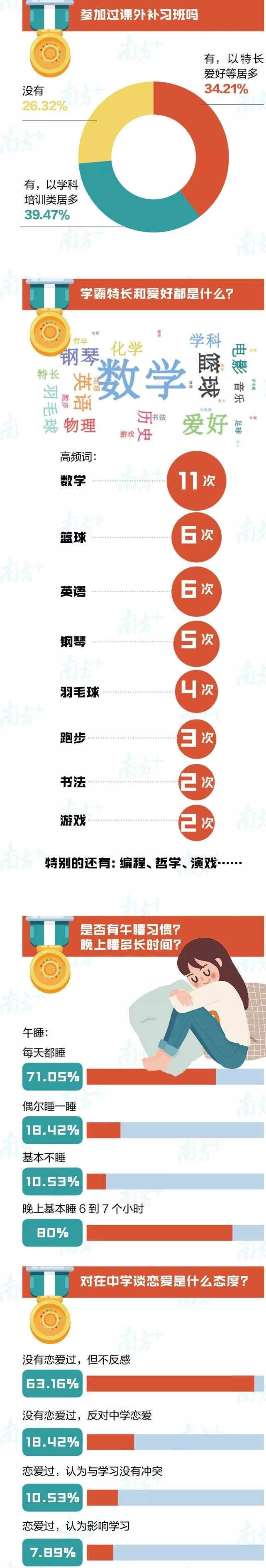不論學(xué)習(xí)再緊張,80%的“牛娃”還是基本保證了6-7小時的晚間睡眠,還有超過70%的“牛娃”堅持午睡,為下午的學(xué)習(xí)充充電。